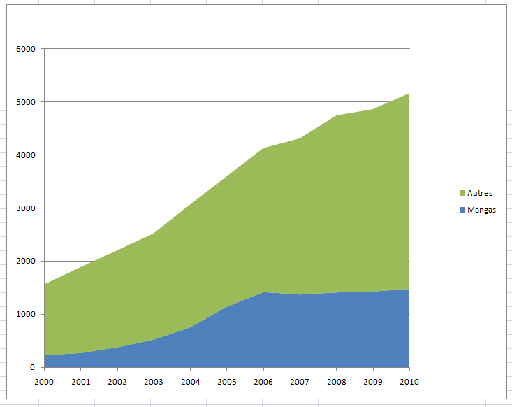 le manga s'installe lentement jusqu’en 2004, mais sa courbe est moindre que celle de l'augmentation des titres, de 2004 à 2006 il connaît une très grosse poussée, certes, mais là aussi sa courbe est moindre. Et surtout, à partir de 2006, il stagne en terme de titres, alors que le total s'envole.