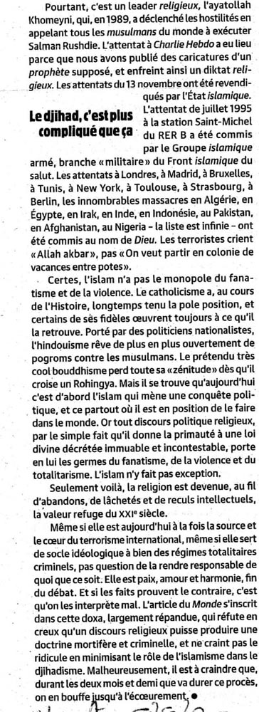 Et je ne suis pas de ceux qui jette un anathème sur l'ensemble de la communauté musulmane. Je souhaite ardemment que les refus affichés et la lutte contre l'intégrisme islamique soient portés par les musulmans eux-mêmes, qui sont infiniment mieux placés pour la mener à bien et éradiquer de leurs rangs les assassins.