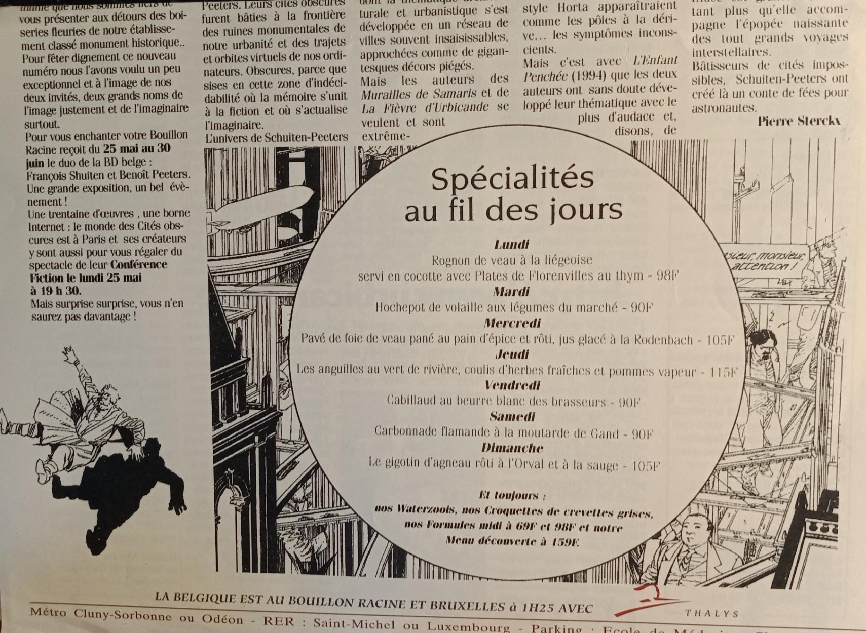 “Non, je ne peux pas refuser”, insiste Schuiten qui lève un coin de voile sur le petit garçon à qui son père architecte a très tôt offert une boîte d’aquarelles. “Le titre du magazine - Moustique - est une chose qui m’a toujours frappé et fait partie de ma mémoire d’enfant.” C’est cet enfant qu’il a mis en scène, le regard levé vers les enseignes lumineuses de Moustique, de Spirou et de Tintin dont on n’aperçoit que la moitié d’un nom si célèbre qu’il n’est nul besoin de le lire en entier pour le capter. “J’ai choisi cette ambiance nocturne et cette idée des enseignes qui brillent car, quand j’étais plus jeune, ces journaux étaient pour moi comme des phares dans la nuit”, commente le dessinateur attendri par son sujet. C’est qu’au siècle dernier, au plus fort des années 60 et 70, ces trois titres de presse composent le triangle d’or où se retrouve la Belgique des loisirs.