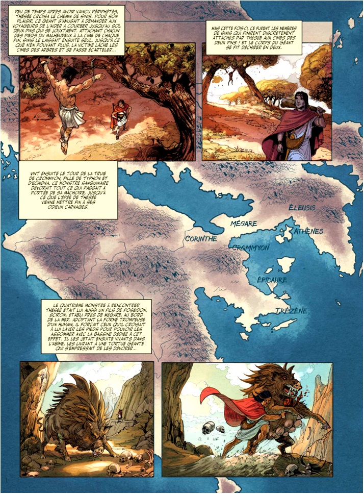 D'ailleurs, sur cette même double page, j'ai trouvé étonnant le placement des cartouches qui sont parfois éloignées des illustrations qu'elles décrivent (la truie de Crommyon en-dessous du géant écartelé, Sciron au-dessus des vignettes de la truie...)