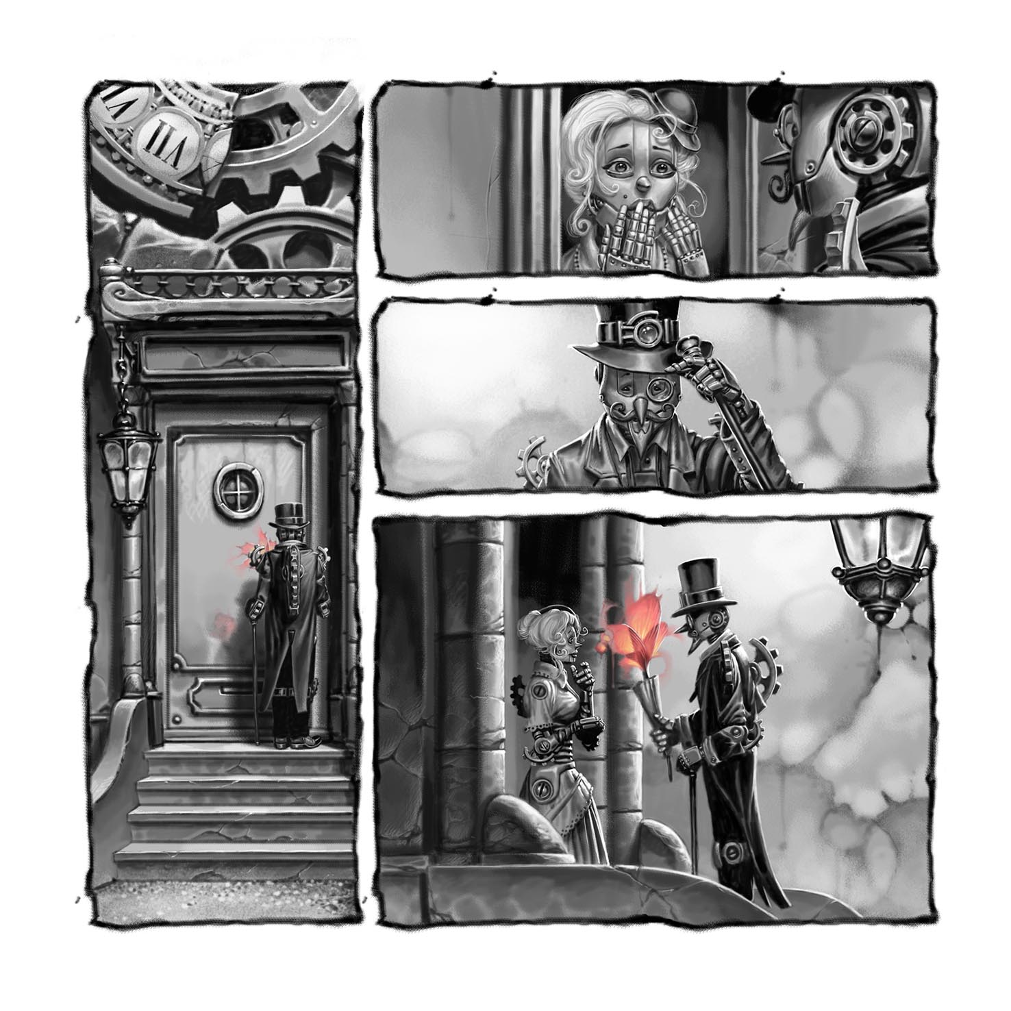 L'univers steampunk est celui de petits pantins mécaniques qui vivent dans un monde en noir et gris. Les seules manifestations de couleurs proviennent de leurs émotions et de ce qui échappe à la rationalité.