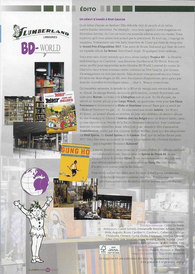 - depuis le n°37, le titre est "Le magazine des librairies Slumberland BD World" et l'éditeur "Slumberland / BD World" suite à l'association des deux réseaux de librairies