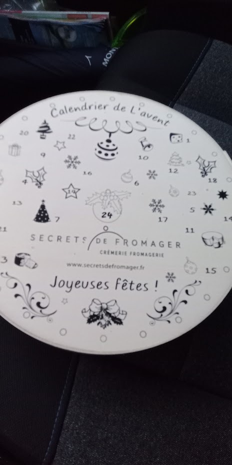 Moi aussi mon conjoint m'a offert un calendrier de l'avent d'un fromager du coin : il se présente dans une boîte de Saint Nectaire en bois de 26 cm de diamètre et chaque fromage à un n° avec la légende collée à l’intérieur du couvercle de la Grande boîte