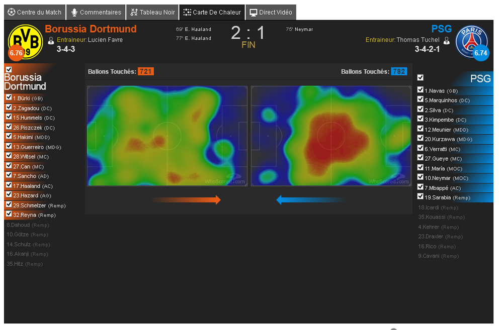 En voyant ça, c'est impossible de dire que Silva a joué bas à Dortmund. En revanche, on voit la différence entre les matchs maîtrisés et les matchs qui se passent mal, il joue davantage au centre. Sachant qu'il a toujours eu Kimpembe comme DC avec lui sauf la remontada.