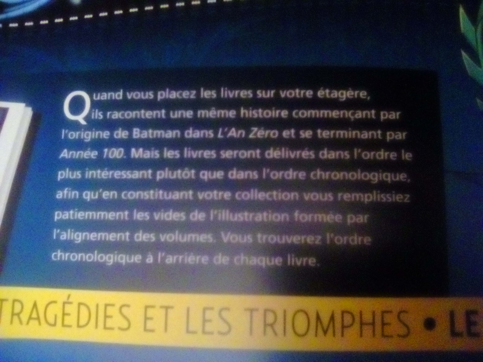 Donc, en gros, pendant deux ans et demi, je reçois des récits de qualité très variable se positionnant sur la frise du 1 au 80, pour la dernière année, recevoir les récits majeurs, qui viendront combler les trous de la frise. Soit, des récits comme Année un, un long halloween ou amère victoire, qui devraient trouver leur place dans le début de la collection (dans les quinze premiers en gros non?).