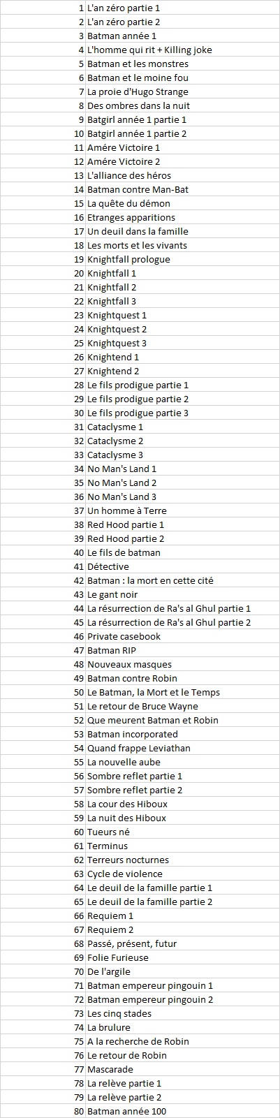 Il manquerait "Batman: Mad Love", "Arkham Assylium par Grant Morrison", "Dark Knight, Dark City", "Les Derniers Jours de Chevalier Noir", "Batman: Le Culte", "La Naissance du Démon", ou "JLA: La tour de Babel" pour ne citer qu'eux.