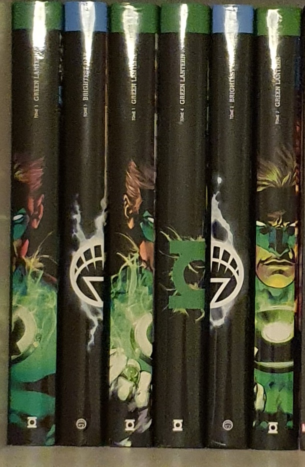 On voit bien que ce n'était pas du tout prévu au départ. Mais à ce moment là ils auraient pu réimprimer des jaquettes pour avoir un hal Jordan sur 5 tomes, bien centré, auquel ils auraient juste eu à rajouter ses épaules droite et gauche. Avec pourquoi pas les autres corps en arrières plans comme à l'époque sur la page d'abonnement sur le site Eaglemoss.