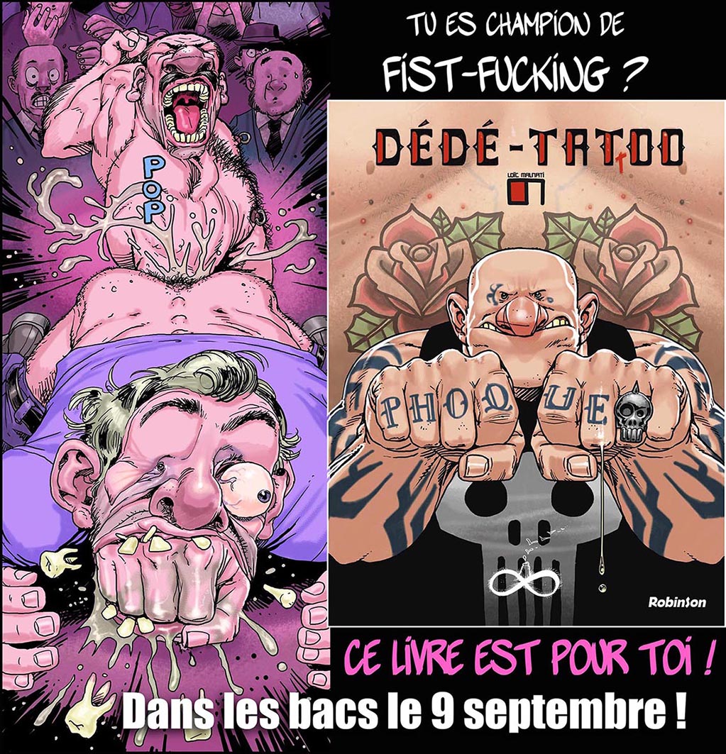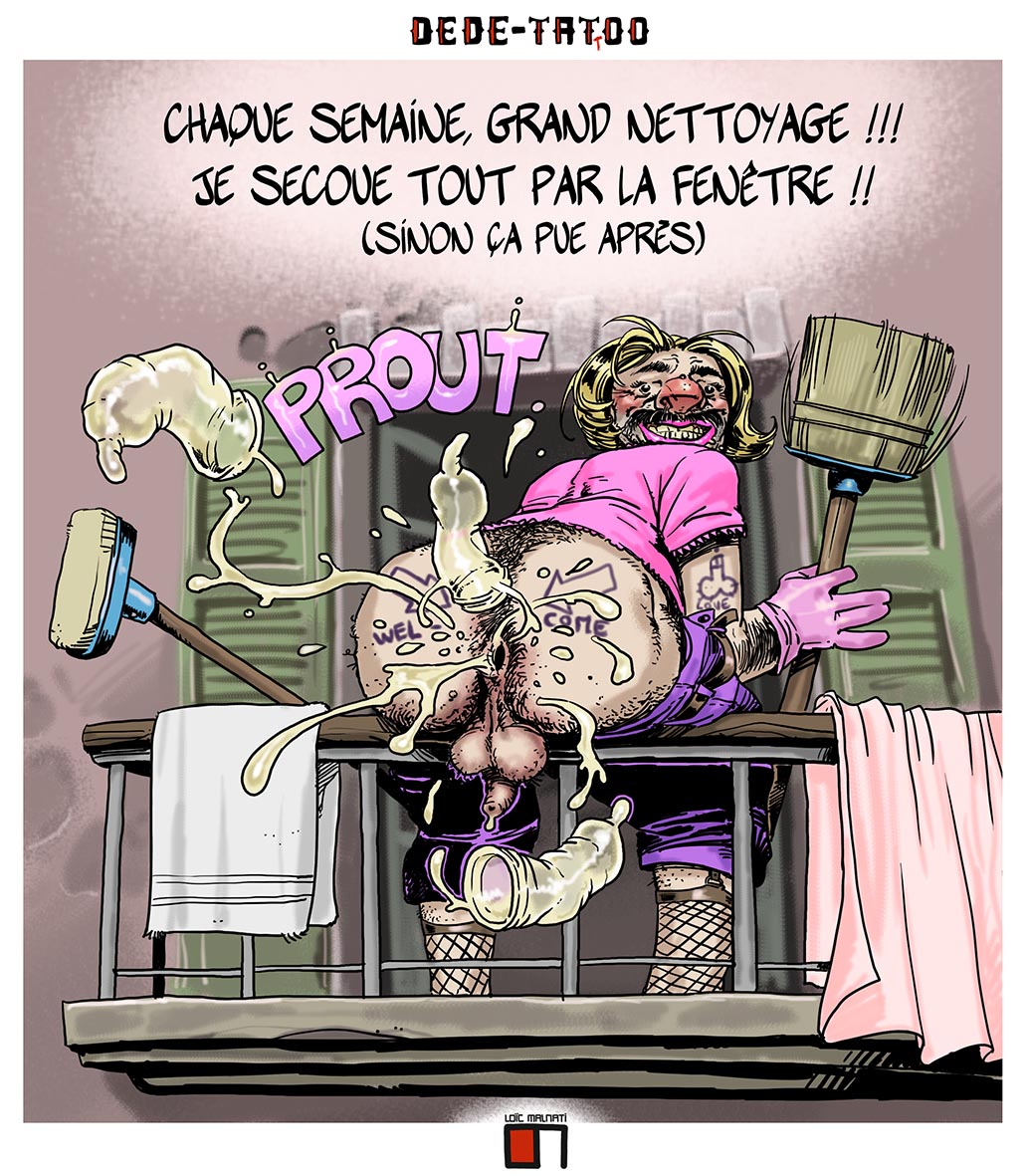 Je vais lancer un compte à rebours à partir du premier septembre : les tatoués lisent Dédé aux chiottes. Chaque jour je dessinerai un tatoué dans ses toilettes. Je vous les posterai, parce que vous êtes (discrets mais) gentils.