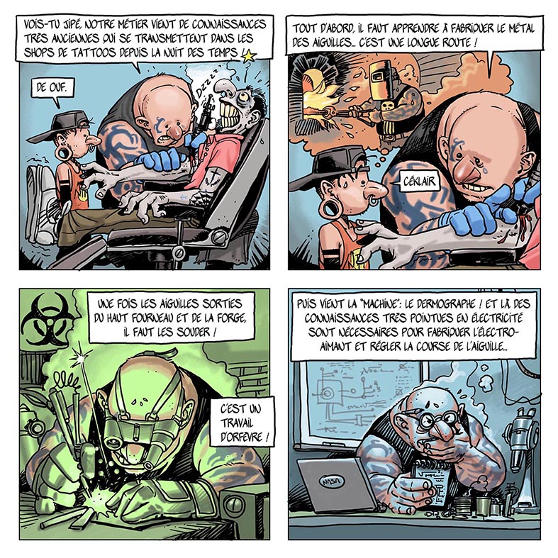 L'idée m'est venue d'un livre que j'ai sorti il y a peu pour enseigner les bases du tatouage, et j'ai eu affaire à une levée de boucliers de tatoueurs que j'ai appelé "Dédé Tattoo", les tatoueurs à l'ancienne qui ne veulent pas qu'on ouvre le métier au grand public.
