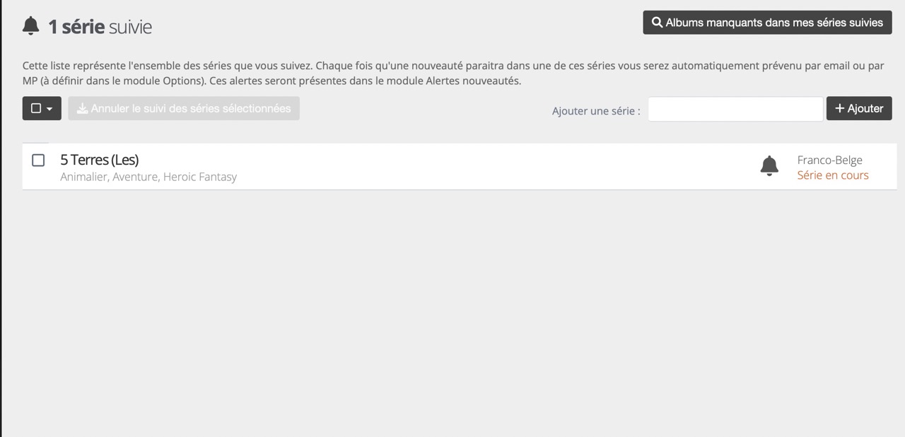 Et tu verras, dans "Alertes et suivis" / "Alertes nouveautés" ou "Mes séries suivies", les nouveautés qui t'intéressent, de même que tu recevras une notification à chaque sortie (à paramétrer, par mail ou par MP):