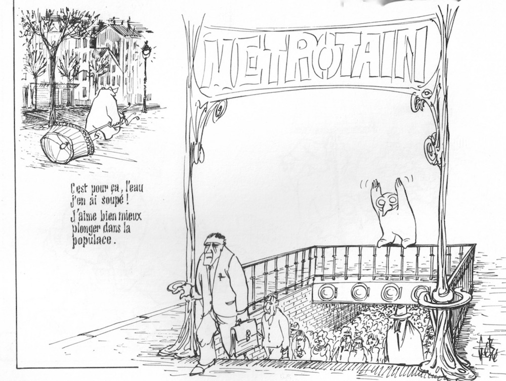 Dans une bande dessinée actuelle, le dessineux aurait fait un véritable geyser qui sortirait de terre, tellement ce dessineux serait influencé par les séries américaines, lorsqu'une bagnole fiche en l'air une borne d'incendie, comme cela arrive souvent dans les feuilletons...