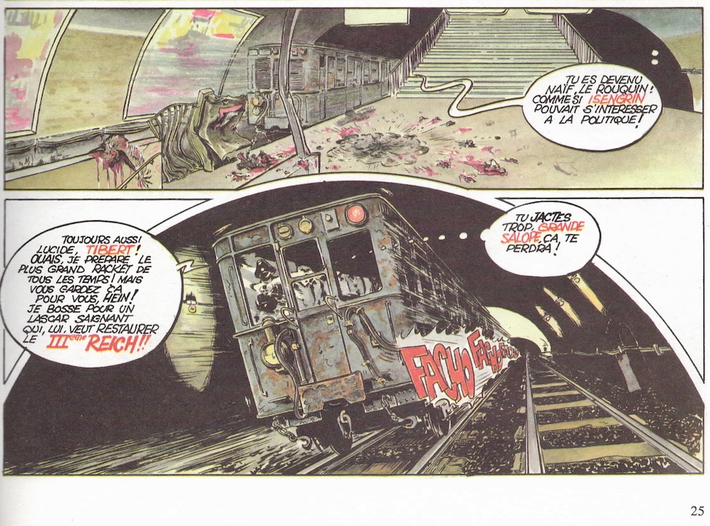 Le son du roulement correspond à des personnages très curieux (et malfaisants) que l'on trouve dans cette BD. ( Pour les techniciens, remarquons que cette rame Sprague s'abstient de la prise de courant fournie par le troisième rail latéral, lui aussi absent. Je pense que c'est là un oubli du dessinateur).