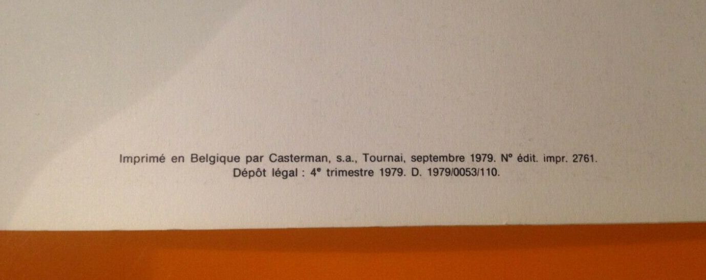 Imprimé en Belgique par Casterman, s.a Tournai avril 1984. N° édit.-impr. 2988.