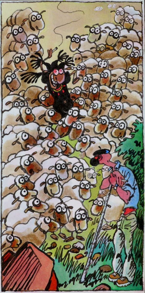Téléférique fou et « fondue au dénum »On l'aura compris: la montagne est hostile. Surtout au rationaliste dans la vallée ou au visiteur qui dérange le bon ordre parfait ci-dessus décrit. Les chasseurs se font tuer par leur propre fusil, les touristes sont lynchés, le téléférique fou écrase les skieurs, les avions se crashent, les emmerdeurs sont scalpés (« On nous tond bien, nous! ») et si une brebis bouche le trou de sa baignoire avec son canard en celluloïd, un lac se crée qui inonde le paysage. La faune est variée (lions, girafes, gnous, hermines, etc.) et les aigles font des concours d'enlèvement de brebis, comme dans le Baron Noir de Got et Pétillon.