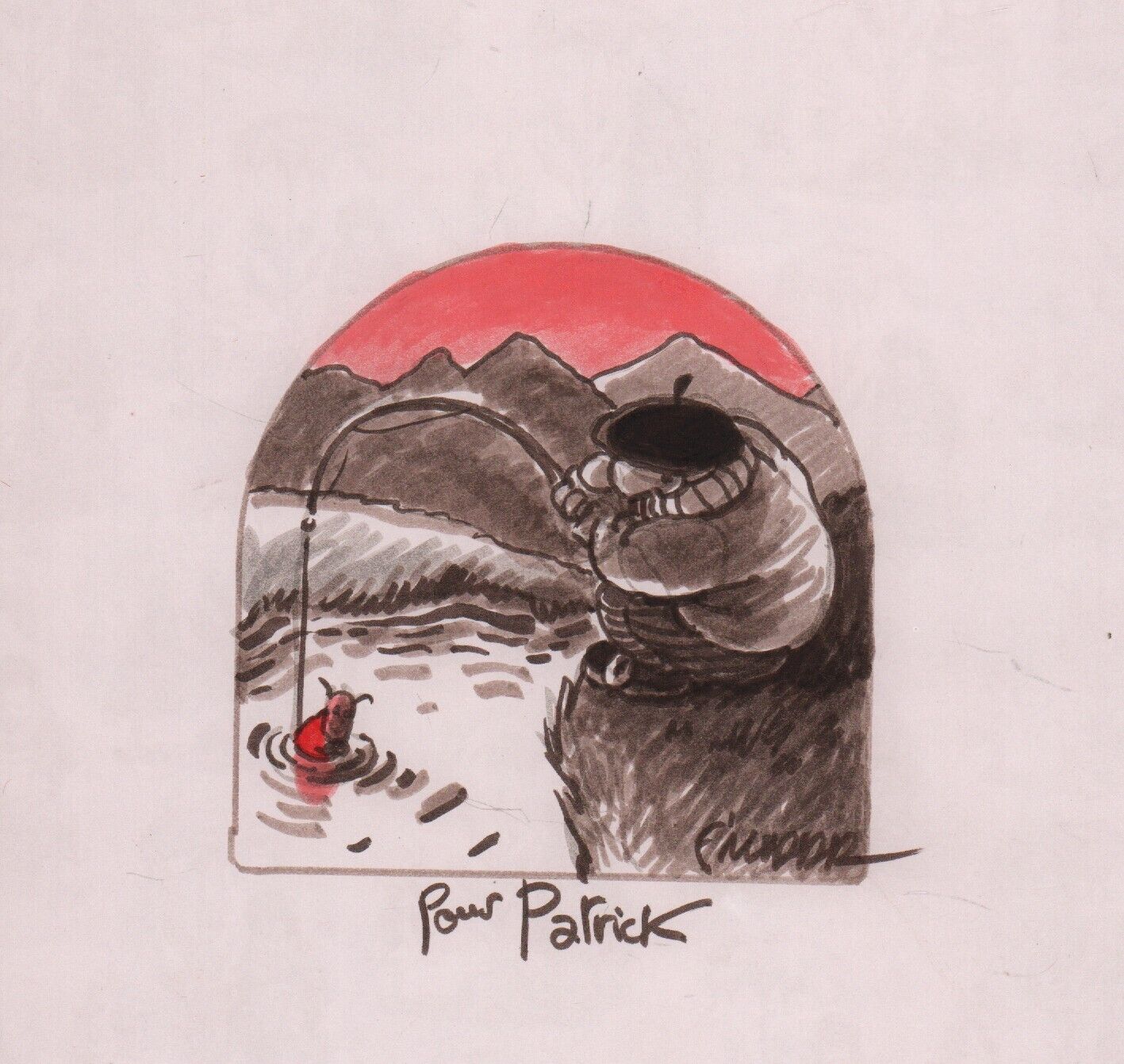 Je me rappelle qu'il m'avait dit avoir envoyé un jour un dessin pour un de leurs menus - avec un dessin se référant à la Boule de Cristal, je crois - et que ce dessin n'était pas parvenu à temps à ses destinataires.