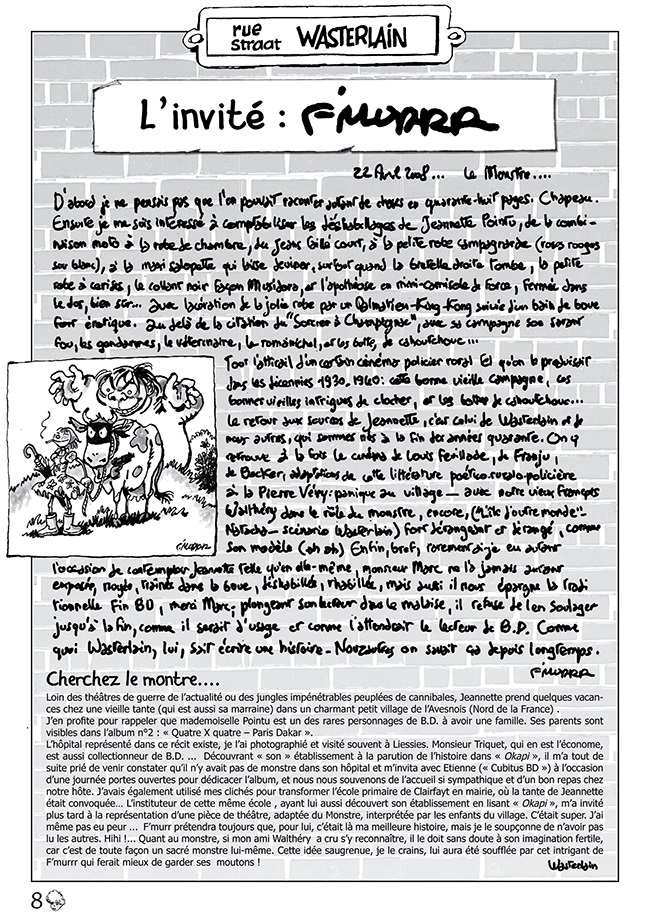 Le retour aux sources de Jeannette, c’est celui de Wasterlain et de nous autres, qui sommes nés à la fin des années quarante. On y retrouve à la fois le cinéma de Louis Feuillade, de Franju, de Becker, adaptations de cette littérature poético-ruralo-policière à la Pierre Véry : panique au village – avec notre vieux Walthéry dans le rôle du monstre, encore (« l’île d’outre-monde » - Natacha – scénario Wasterlain) fort dérangeant et dérangé, comme son modèle (ah ah). Enfin bref, rarement ai-je eu autant l’occasion de contempler Jeannette telle qu’en elle-même, Monsieur Marc ne l’a jamais autant exposée, noyée, traînée dans la boue, déshabillée, rhabillée, mais aussi il nous épargne la traditionnelle fin BD, merci Marc ; plongeant son lecteur dans le malaise, il refuse de l’en soulager jusqu’à la fin, comme il serait d’usage et comme l’attendrait le lecteur de BD. Comme quoi, Wasterlain, lui, sait écrire une histoire. Nouzautres on savait ça depuis longtemps… »
