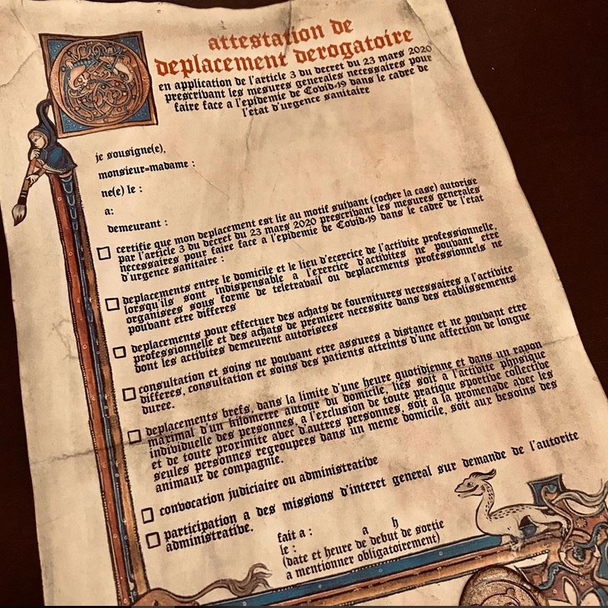 Boulet s'est dessiné une attestation de déplacement... il annonce sur Instagram qu'il vendra l'original si il se prend une prune !!