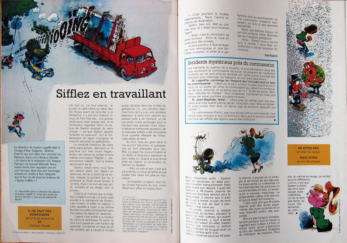 Concernant le n°de Spirou 3599 de 2007 (que je n'ai pas) , BDoubliees.com nous dit qu'il y a un "en direct" titre : "Sifflez en travaillant".