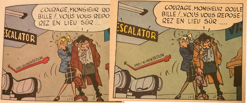 Le seul truc de rajouté à vue de nez, c'est le trait bizarre sur l'escalator (lubie de coloriste ?).
