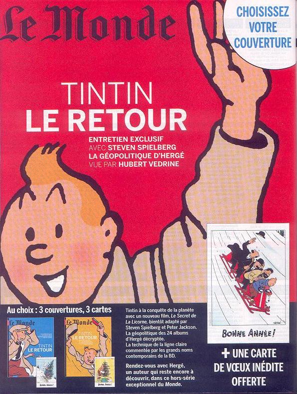 À peine remis du hors-série de L'Express, c'est Le Monde qui remet le couvert avec son spécial Tintin Le retour ! Comme il te connaît bien, il te propose trois couvertures différentes de son numéro ; comme il ne te connaît pas si bien que ça, il essaie de te faire croire que tu vas avoir droit à l'une des trois cartes de vœux inédites offertes en cadeau ("inédites", tu en rigoleras quand tu auras vu les visuels).