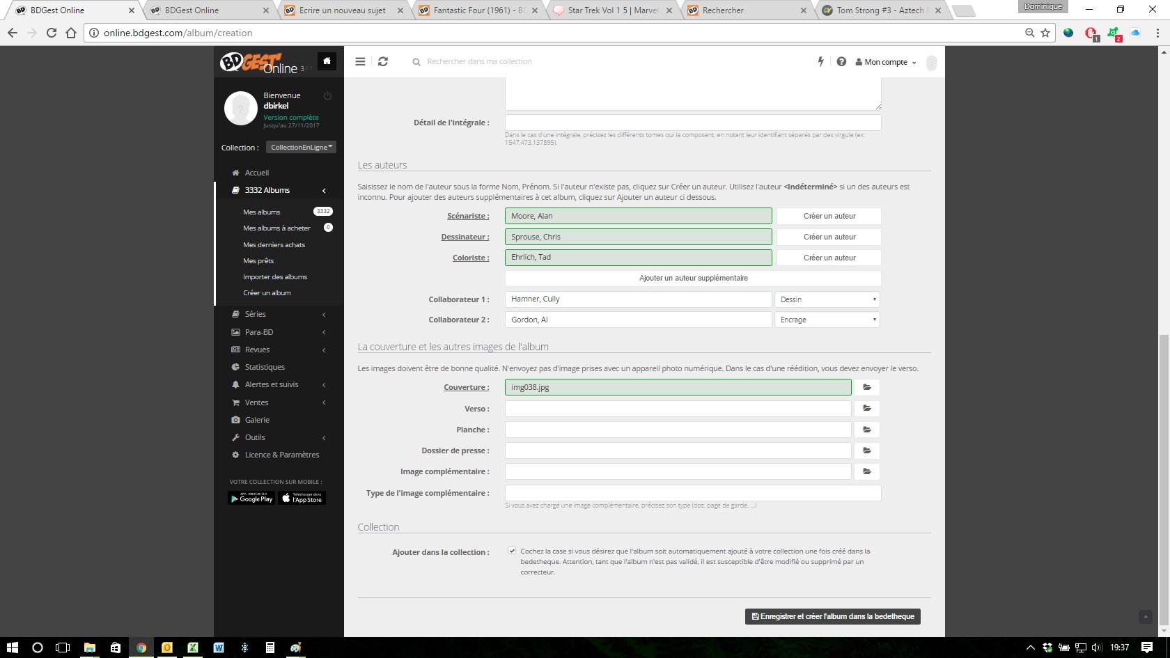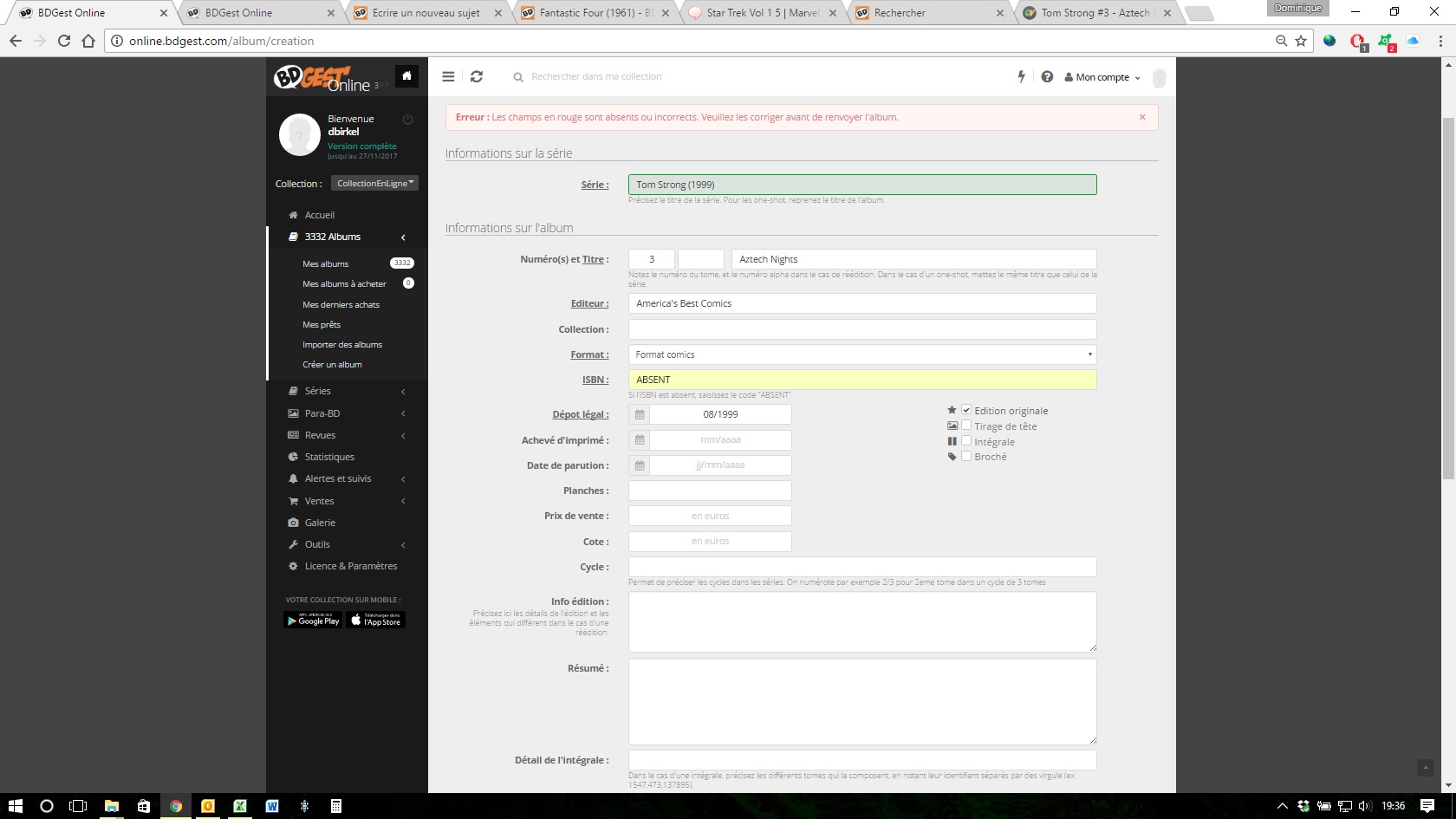 J'essaie de créer un album "Tom Strong 3" d'America's Best Comics et j'ai à chaque fois le message "Erreur : Les champs en rouge sont absents ou incorrects. Veuillez les corriger avant de renvoyer l'album."