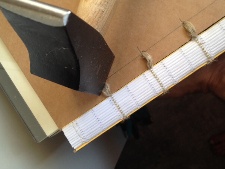 Une fois tout vérifier , vous étalez la colle avec votre pointe en os et ce que je fais moi , c'est mettre quelques coups de marteau pour commencer à bien aplanir les ficelles .