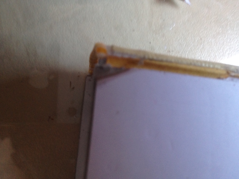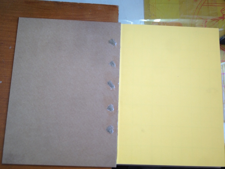 On met le livre sur le bord d 'une table tout en laissant pendre le premier plat . On l 'enduit de colle .