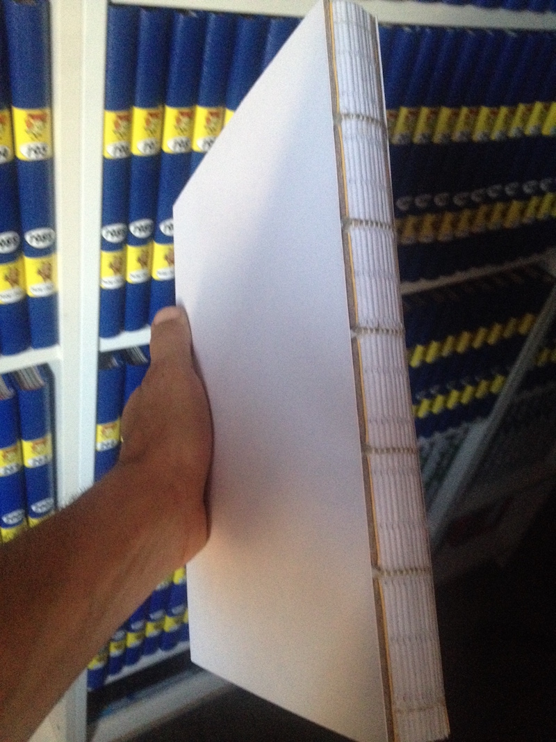 Planche et mise sous poids , pour ma part , je met le livre sur le bord de la table , je mets une planche et finalise le serrage par deux serre joints au niveau des ficelles fraîchement collées. (j' utilise des serre joints en plastique , vous savez ceux que l 'on pompe pour les serrer).