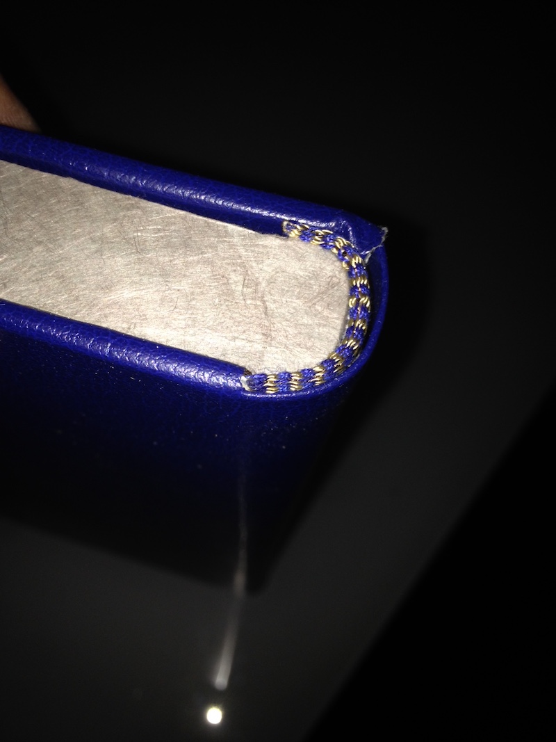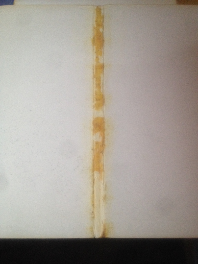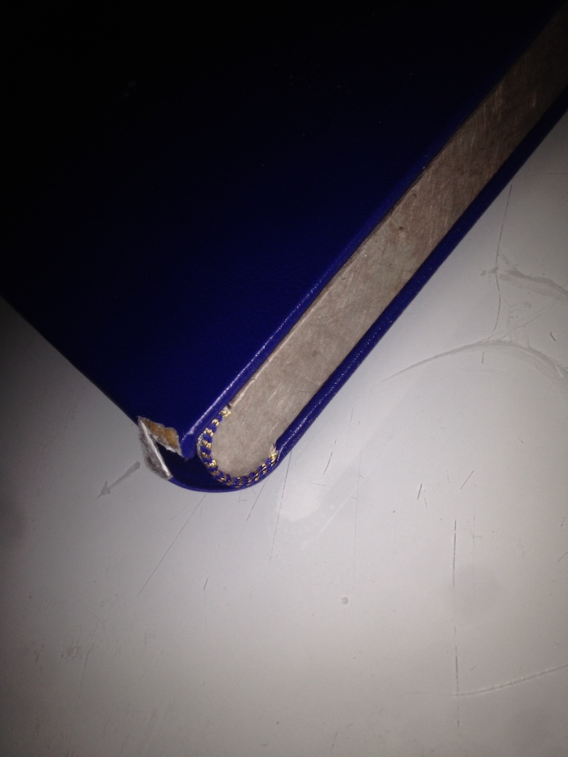 Because, un sagouin , a du recoller la couverture sur les cahiers avec de la colle néoprène (vous savez la bonne marron qui sert à recoller les semelles). Le comble de tout , c 'est en le recollant , il a mal aligné les deux du coup , l 'ensemble des plats et dos sont écrasés , du au décalage.