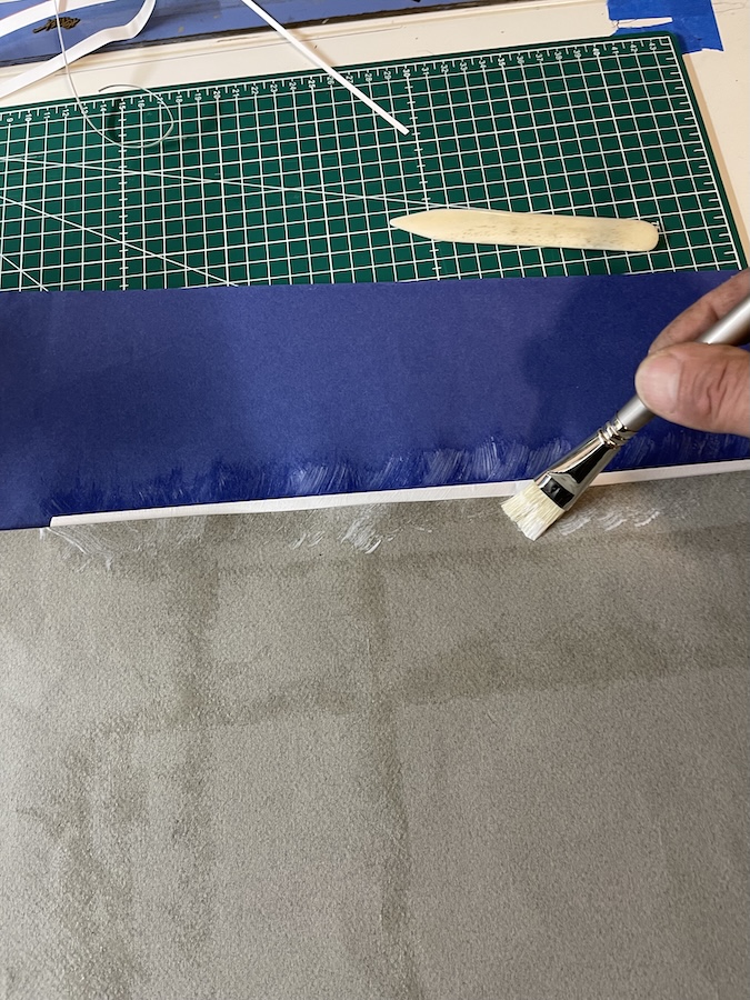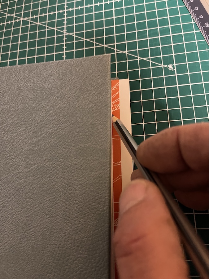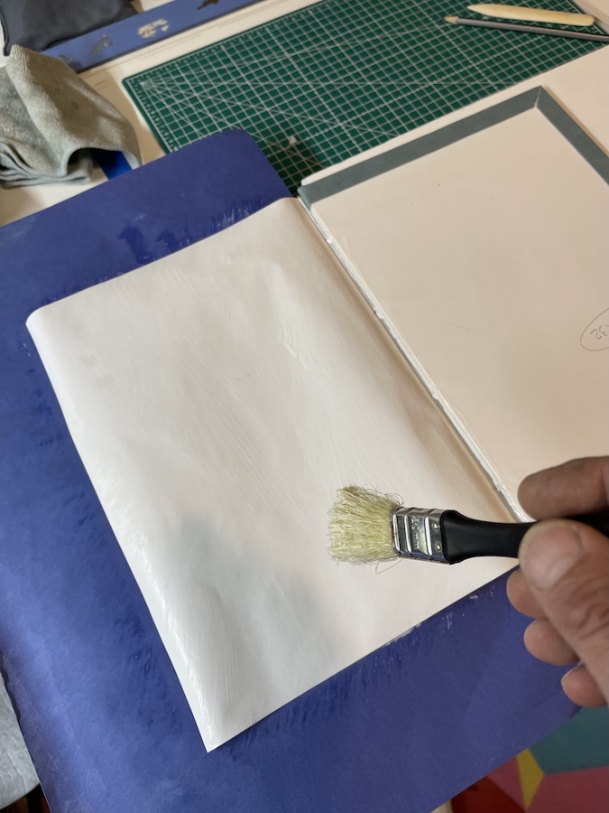 Sans le livre , on plie correctement la garde et avec deux feuilles , on prépare celle de dessus afin d'encoller que un demi cm du bord coté livre.
