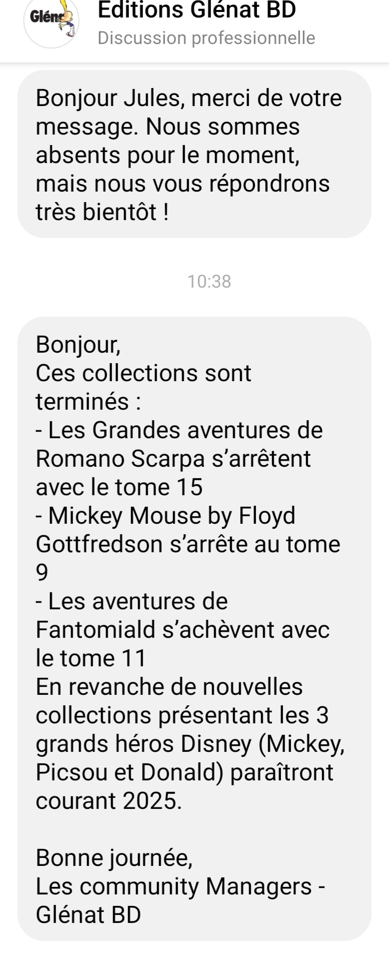 jb18v a écrit:Je relaie ici l'info via HFR et chris54330 : Glénat qui reconnait que des collections sont interrompues (par échange Messenger, pas encore communiqué officiellement, d'ailleurs j'ignore comment ils font dans ces cas ?)Je déteste être porteur de mauvaise nouvelle mais je viens d'avoir la confirmation par Glénat de l'arrêt des différentes collections :