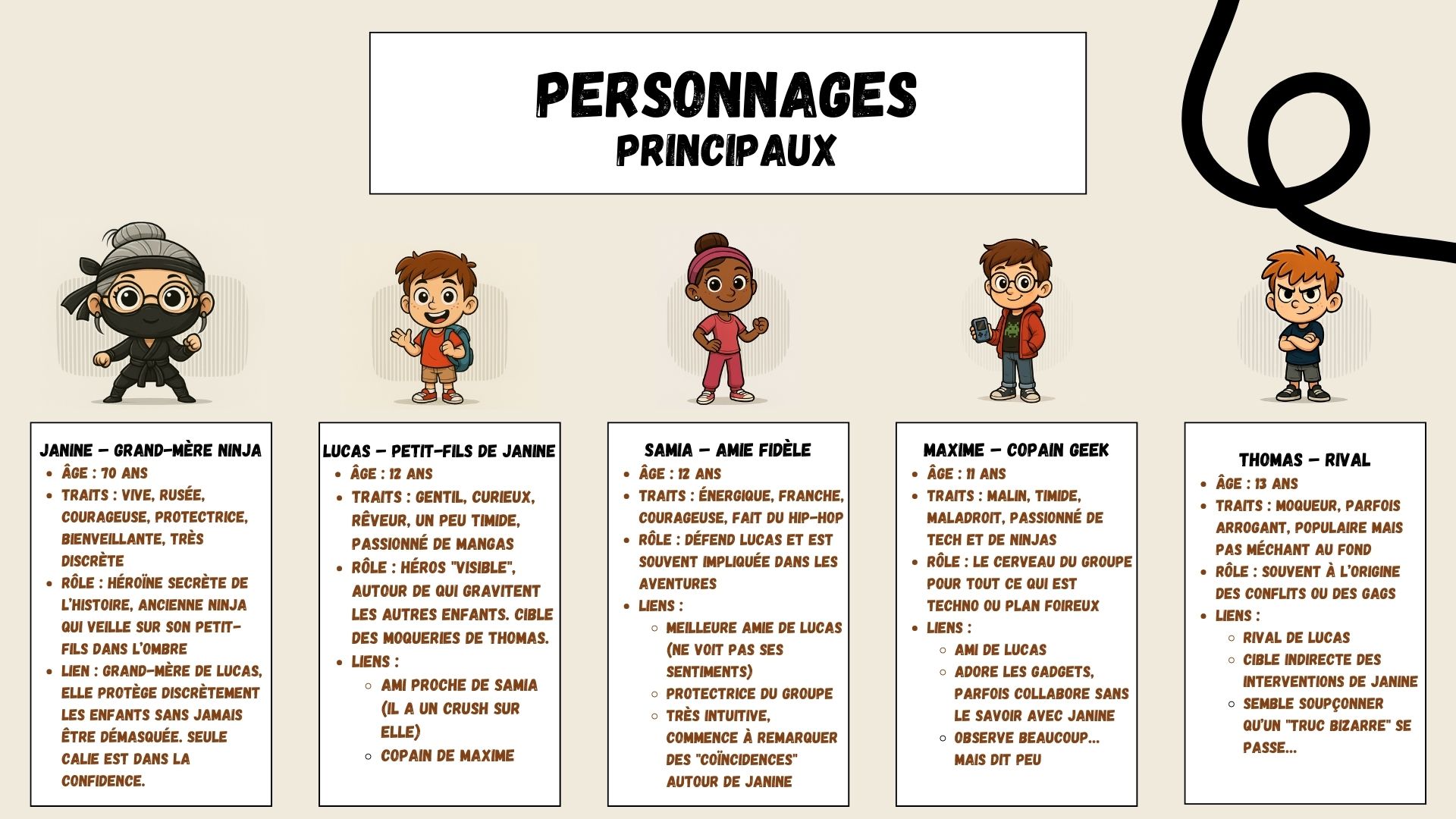 Voici le pitch :Janine, une grand-mère vive et rusée au passé mystérieux, reprend du service dans l’ombre pour protéger son petit-fils Lucas, un garçon qui attire un peu trop les ennuis. Ancienne ninja, elle agit sans jamais révéler sa véritable identité, épaulée par Calie, sa chienne bringée aussi discrète que malicieuse. Quand l’école devient un champ de bataille, Janine veille… sans que personne ne soupçonne la vérité.L’objectif : créer une série de tomes autour de situations scolaires et sociales dans lesquelles Janine intervient en douce.