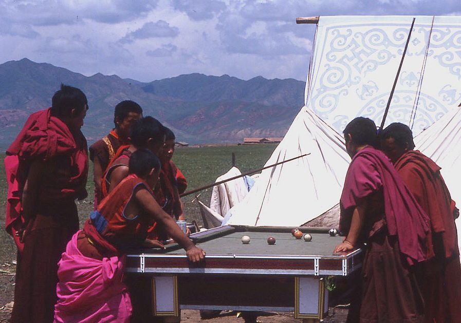 et en bonus, une photo toute pourrie (c'est un scan d'une diapo faite il y a plus de 20 ans, mais le spectacle de ces moines tibétains jouant au billard en pleine montagne m'a toujours amusé)