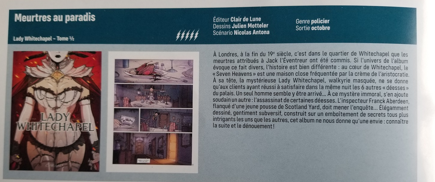 le 07 octobre sortira le tome 1 du diptyque "Lady Whitechapel" aux éditions Clair de Lune avec votre serviteur au scénario et le talentueux Julien Motteler aux dessins.