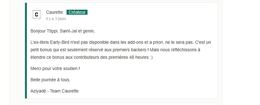 L'information doit dater un peu car les deux contributions à 50 euros et 99 euros respectivement limitées à 100 contributeurs et comprenant l'Ex-Libris Early Bird ont été épuisées dans les heures qui ont suivi le lancement de la campagne ...