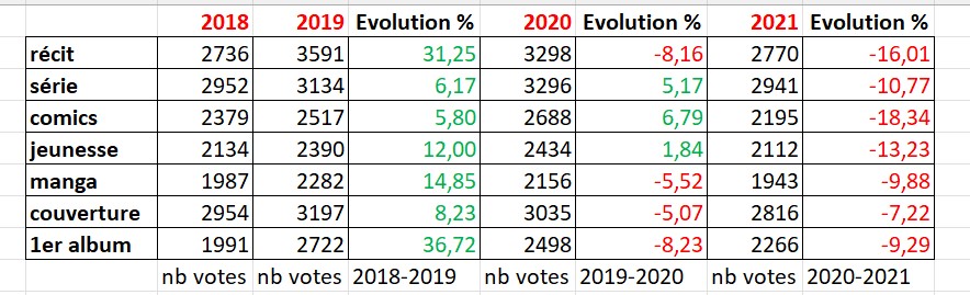 Pour chaque catégorie, un Jury a établi une présélection de 10 titres maximum publiés en 2021 soumis au vote du public. Ce Jury était composé de dix membres inscrits sur le site, parmi lesquels on trouvait les administrateurs, des chroniqueurs réguliers, un libraire et des amateurs éclairés, tous gros lecteurs de bandes dessinées.