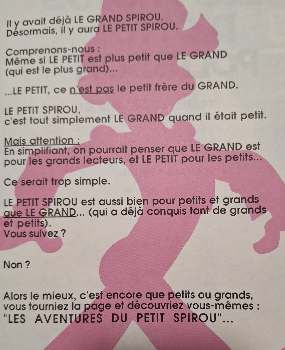 Larry Bambell a écrit:Le dit "petit Spirou" n'a RIEN À VOIR avec Spirou (en dehors du costume)... De l'aveu même des auteurs, je crois ?... (source : wiki)rahoul a écrit:Entre-temps, il y a eu 20 tomes de petit Spirou avec sa famille...