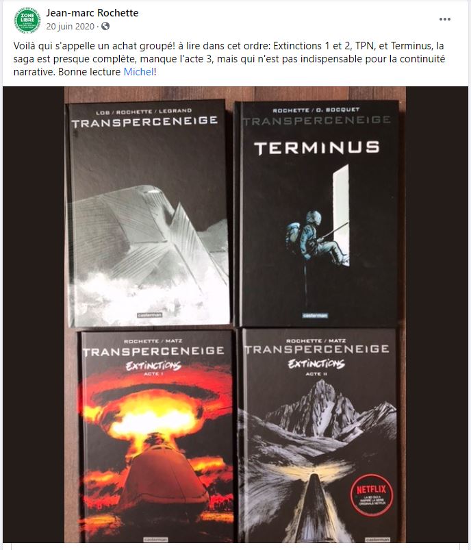 Genug a écrit:C'est un procès d'intention sans nuance, selon moi, et c'est mal connaître l'auteur, ainsi que sa carrière : il faut prendre en compte le fait que les deux bouquins que Rochette a réalisés seul ont connu un beau succès, qu'un troisième est en voie d'achèvement ; ça doit compter dans sa motivation à achever Extinctions -- mais ça ne retire rien à mon amertume à l'idée qu'il n'aille pas jusqu'au bout, et/ou qu'il réserve la conclusion à qui pourra se payer une édition rare et donc sans doute chère. D'ailleurs, ça, ça ne cadre pas avec l'idée que je m'étais faite du bonhomme...fanche a écrit:Il a voulu profiter à l'époque de la sortie du film, ça à moyennement marché, il se barre. C'est typiquement le profil du promoteur immobilier qui exploite un filon et laisse tout tomber dès que ça sent le moisi.