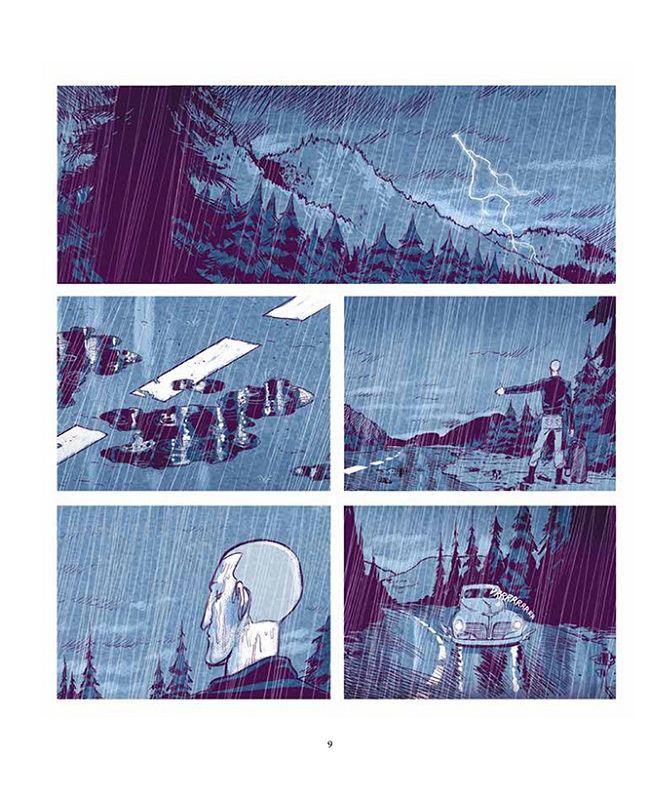 1943. Un homme aux cheveux courts et aux yeux vairons, la trentaine environ, porte un gros sac de toile sous la pluie. Il fait du stop quelque part en Amérique du Nord, sur une route de montagne boisée. Une voiture s’arrête. C’est celle d’un représentant de commerce en bibles qui tente, en réalité, de le détrousser.