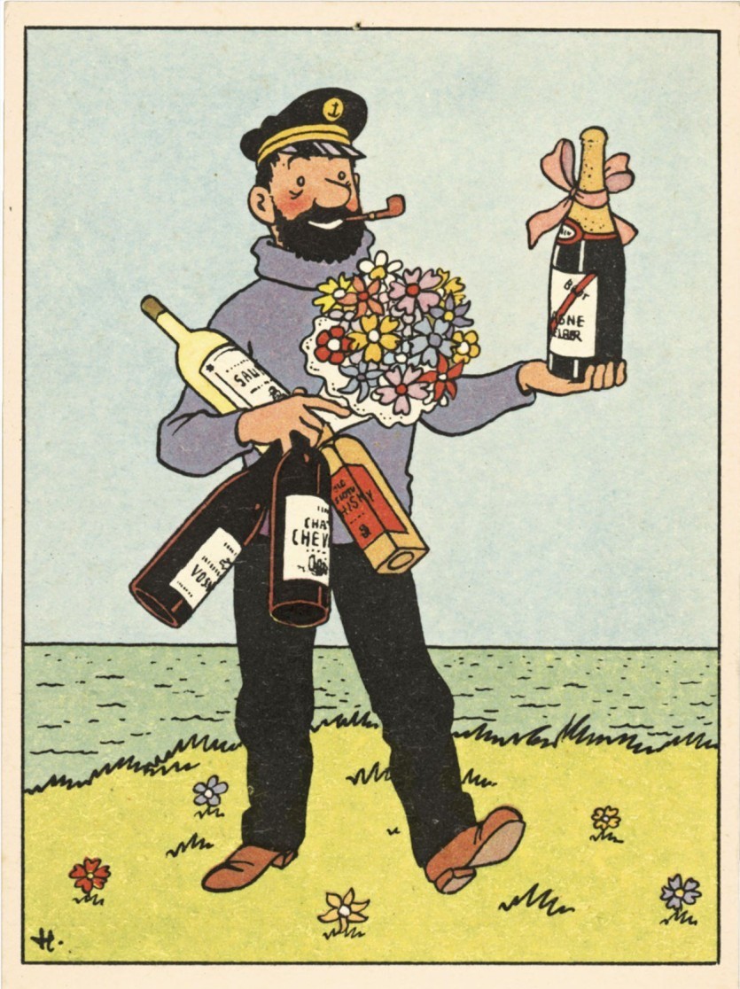 Il s'agit de poster ici, le capitaine Haddock en présence d'une bouteille (d'alcool de préférence).
