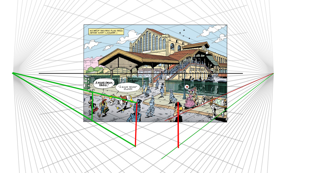 Et non pas sur la bordure du trottoir. Parce que le trottoir lui s'élargit ou est pas droit, pas grave. Quant à la sortie de la gare, d'où sortent Lucky et Jolly Jumper, elle n'a pas à être aligné sur la perspective, au sens que sur le cadastre, bin non, elle est pas perpendiculaire aux grilles, mais en biais, comme beaucoup de sortie...