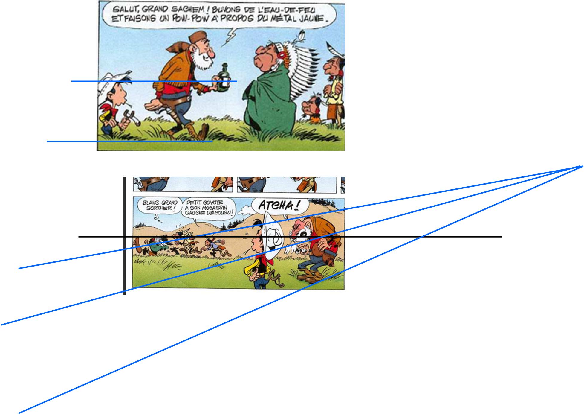 - Case 8, KD est présenté en premier plan (tiens çà fait penser au fameux perso d'Achdé "mal cadré"). Amusons nous à tirer les lignes pour vérifier (Attention, je ne suis pas pro en perspective du tout!) et à comparer les deux cases.