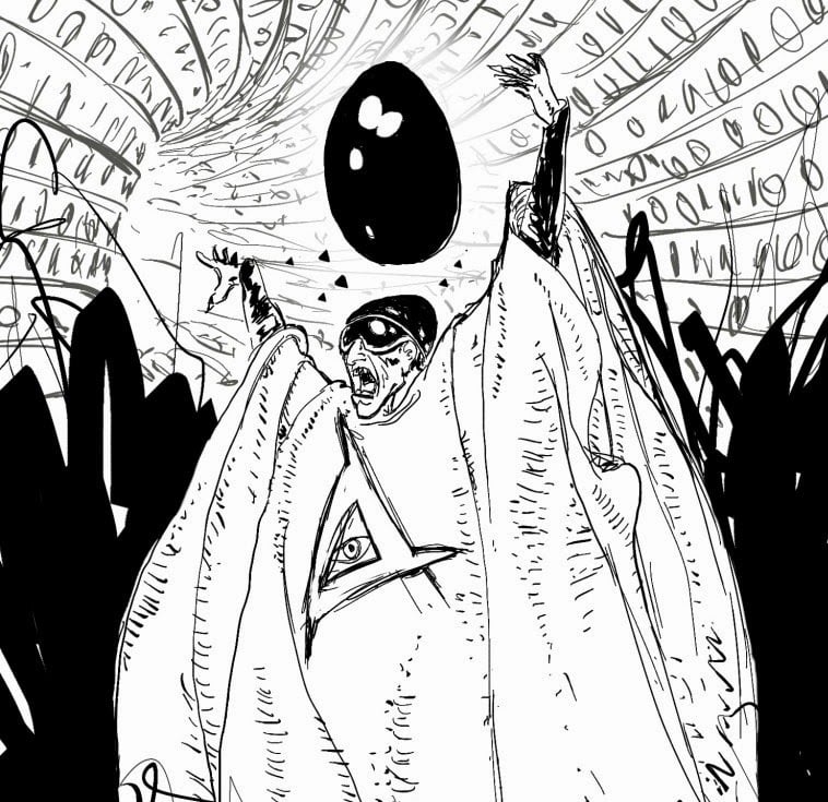 C'est exactement ce que dessinait Moebius. cet absurde renvoyé par l'oeuf. C'est pourquoi le tyran a un oeuf qui flotte au dessus de la tête. Cet "oeuf Moebiusien", c'est l'image de l'oeuf authentique, ce qu'il n'est pas, mais son contraire.