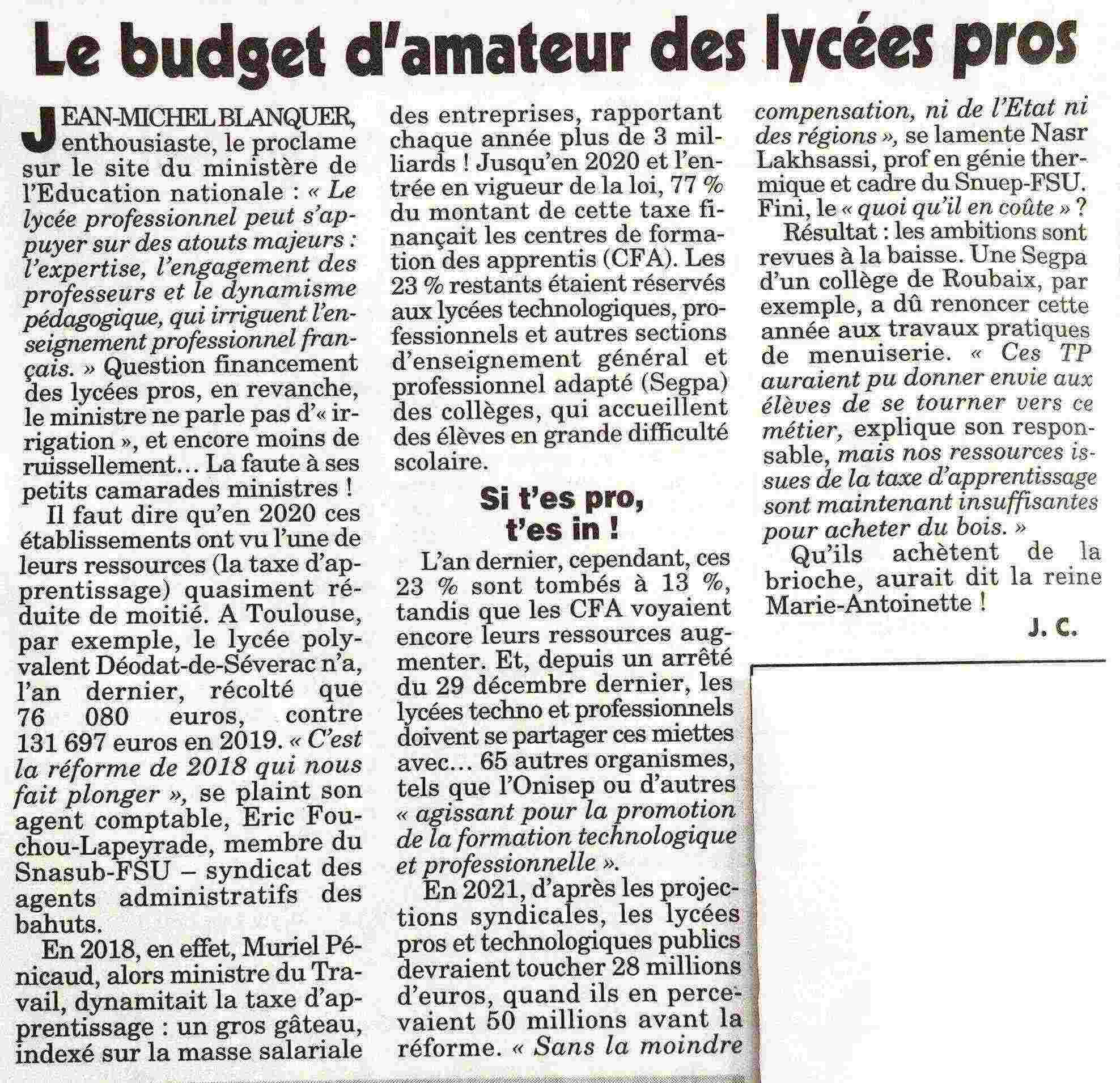 Sur la "solution" heures supp' remplacent les postes supprimés :D’après un rapport du sénateur LR Jacques Grosperrin (sur l’enseignement scolaire dans le cadre du projet de loi de finances pour 2021), « 12,3 millions d’euros de crédits pour les heures supplémentaires n’ont pas été consommés en 2019 ».« En trois ans, il n’y a eu aucune création de postes de conseiller principal d’éducation (CPE) ou de psychologue de l’Éducation nationale, confirme la porte-parole du Snes-FSU. Pourtant, de nombreux établissements demandent des effectifs en plus car il y a, surtout en ce moment, un réel besoin d’écoute et d’accompagnement des élèves. » Et pas question d’heures supplémentaires pour les personnels éducatifs non enseignants.