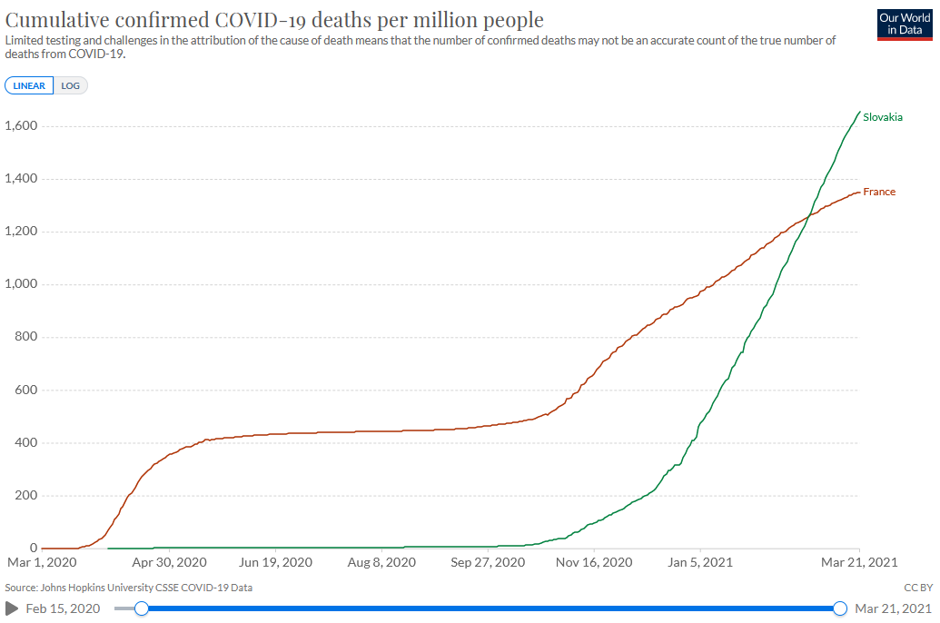 Slovaquie : Les cas de COVID-19 sont en baisse avec 1 615 nouvelles contaminations recensées en moyenne chaque jour. Cela représente 50% du pic des infections — le nombre moyen le plus élevé de cas de contamination quotidiens a été reporté le 6 janvier.