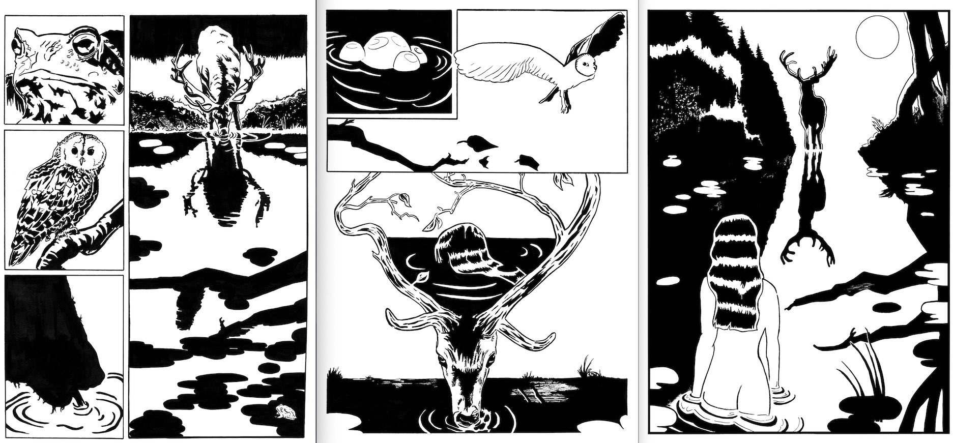 Le parcours naturel de l'oeil sur la dernière case (diagonale haut gauche vers bas droit puis haut droit vers bas gauche, que ta composition épouse remarquablement bien d'ailleurs), ainsi que l'effet de contraste du dos, grande surface blanche, à côté de l'ombre des arbres, grande surface noire, fait inévitablement arriver l'oeil à cet endroit et souligne ce détail précis, d'autant plus avec les ondes arrondies dans l'eau qui en multiplie les formes.