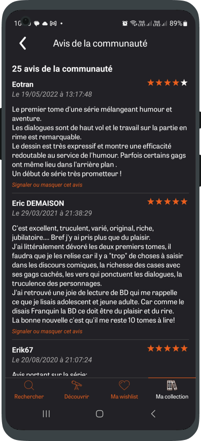 Une rubrique Avis de la communauté a été ajoutée sur la fiche album de votre collection ou de la bedetheque. Vous pouvez ainsi consulter les centaines de milliers d'avis postés dans la bedetheque par les utilisateurs directement depuis votre téléphone.
