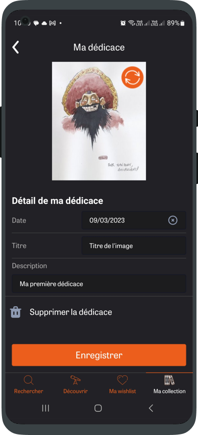 La gestion des dédicaces a également été intégrée à BDGest Mobile. Vous pouvez donc dès maintenant consulter vos dédicaces existantes qui avaient précédemment été ajoutées depuis BDGest Online, mais également ajouter de nouvelles dédicaces en les prenant en photo ou en les intégrant depuis votre galerie. Pour chaque dédicace, vous pouvez, en plus de la photo, préciser une date, un titre et un descriptif.