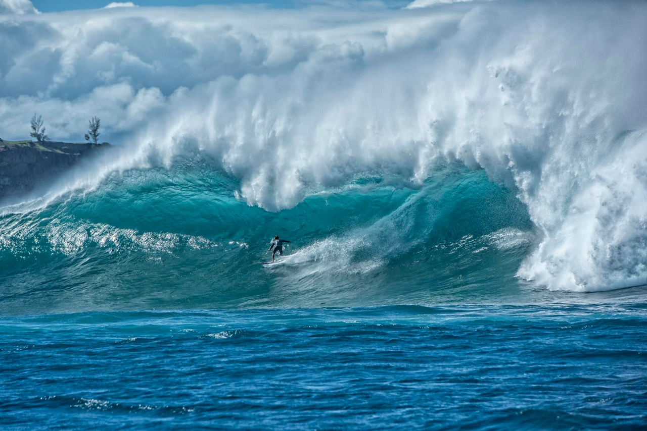 Si c'est bien une falaise avec des arbres en hiver à gauche à mi-hauteur, c'est un fake, avec cette vague tsunami pour surfeur qui s'éloignerait de la terre.