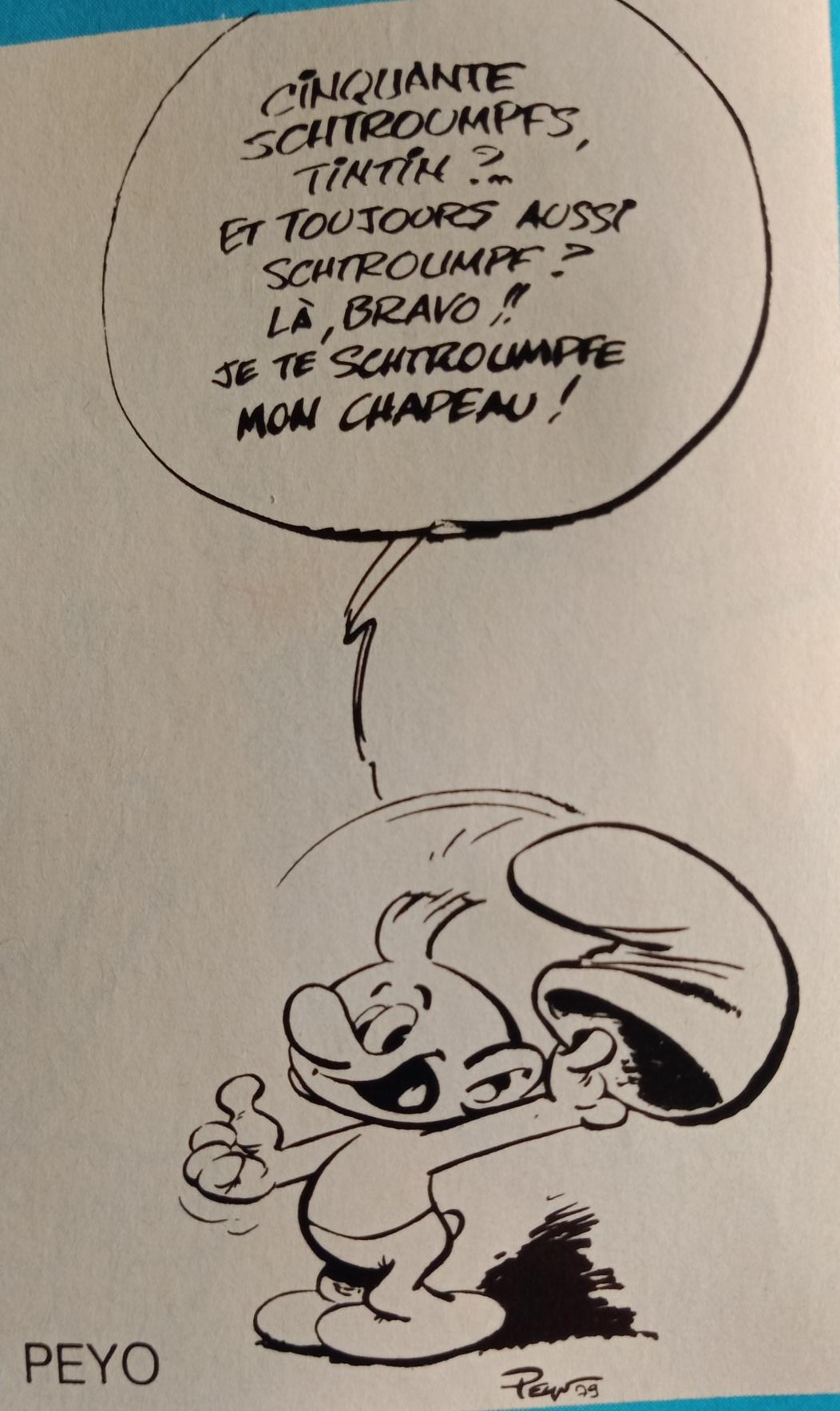 patricelg a écrit:sans doute le seul schtroumpf sans son bonnet sur un dessin dessiné et signé Peyo